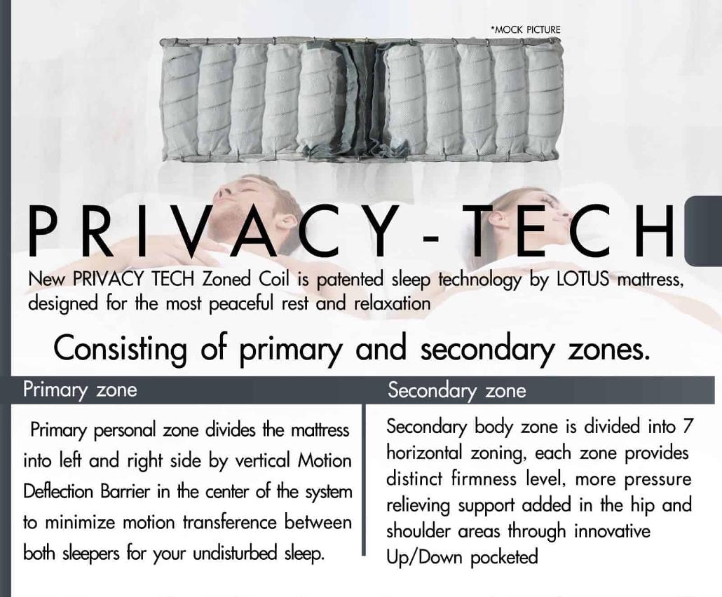 New PRIVACY TECH Zoned Coil is patented sleep technology by LOTUS mattress, designed for the most peaceful rest and relaxation, consisting of primary and secondary zones.