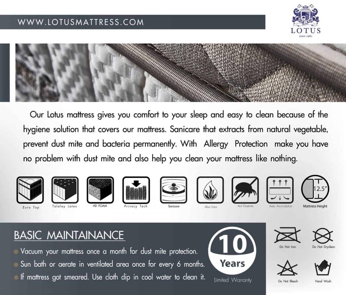 • LOTUS HYGIENE GUARD® surrounds the inner spring coil for soft-touch border and hygiene protection, while safeguarding the mattress from unwanted particle to enter into layers of the mattress, which leads to inhabitant of dust mites and allergens. Another special care from us.